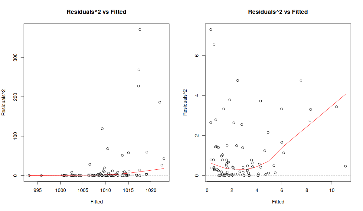 The Figure above shows squared residuals vs fitted values for the location (the plot on the left) and the scale (the plot on the right) models. The former is agnostic of the scale model and demonstrates that there is heteroscedasticity of residuals (the variance increases with the increase of the fitted values). The latter shows that the scale model managed to resolve the issue. While the LOWESS line demonstrates some non-linearity, the distribution of residuals conditional on fitted values looks random.
