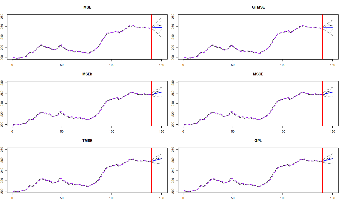 We can see how shrinkage shows itself in the case of the smoothing parameter \(\beta\), which is shrunk to zero by MSEh, TMSE, MSCE and GPL but left intact by MSE and shrunk a little bit in the case of GTMSE. These different estimates of parameters lead to different forecasting trajectories and prediction intervals, as can be shown visually:
