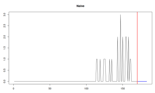 However, in case of intermittent demand, the demand itself does not happen on every observation. As a result, when the Naive copies the last available value, it can either reproduce either a proper non-zero demand, or just the absence of demand. The latter implies that nobody bought our product today, and nobody will do in the next week or whatever the forecasting horizon we use. In the following image, Naive will be the most accurate forecasting method, because in the training set, the final observation was zero, and in the test set we did not have any sales: