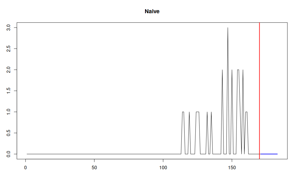 However, in case of intermittent demand, the demand itself does not happen on every observation. As a result, when the Naive copies the last available value, it can either reproduce either a proper non-zero demand, or just the absence of demand. The latter implies that nobody bought our product today, and nobody will do in the next week or whatever the forecasting horizon we use. In the following image, Naive will be the most accurate forecasting method, because in the training set, the final observation was zero, and in the test set we did not have any sales: