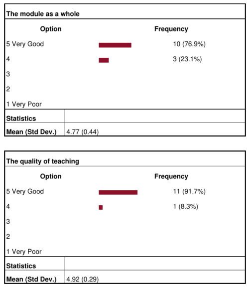 Attached to this post is the student evaluation score for the module. Yes, the number of responses is quite low (only 50% of the cohort), but it should still give a sense of how students perceived Statistics and Descriptive Analytics. Of course, this reflects only their impression – coursework submissions are yet to come – but it’s still an encouraging sign that some things worked well.