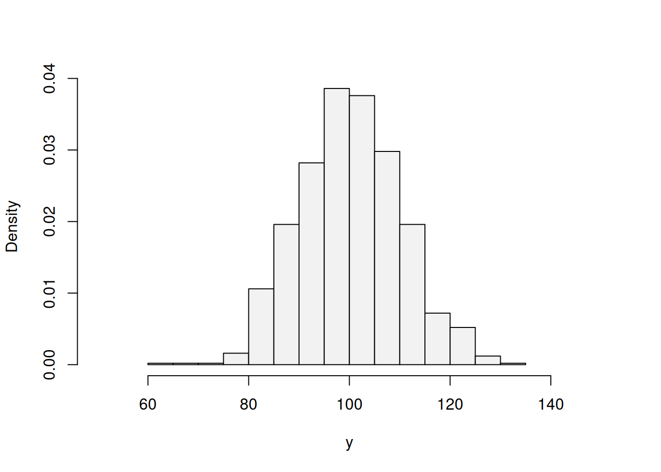 hist(y, xlim=c(50,150), main="", probability=TRUE, col=17)